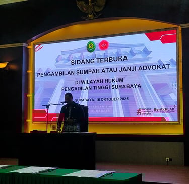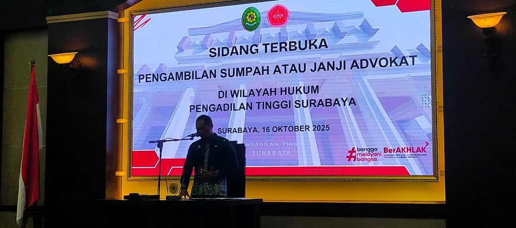 Surabaya, BPW PERADIN JATIM – Badan Pengurus Wilayah (BPW) PERADIN Jawa Timur sukses menyelenggarakan pengambilan sumpah 35 advokat baru hasil Pendidikan Khusus Profesi Advokat (PKPA) Angkatan ke-21 dan 22. Acara berlangsung di Pengadilan Tinggi Jawa Timur, Kamis (16/10/2025), dan dipimpin langsung oleh Ketua Pengadilan Tinggi Jawa Timur, Sujatmiko, S.H., M.H.