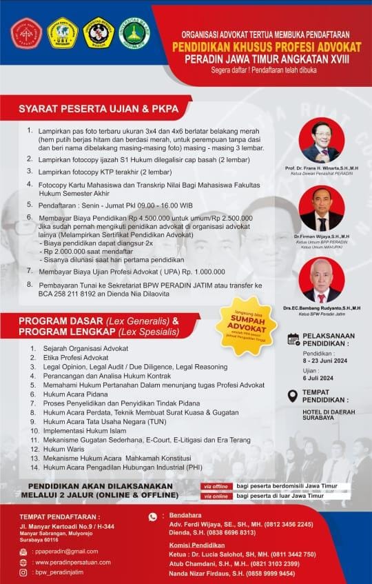 Kantor Badan Pengurus Wilayah Jawa Timur (BPW) Peradin Jatim : Jl. Manyar Kertoadi No.9/ H-344, RT.02, RW.09, Kel. Manyar Sabrangan, Kec. Mulyorejo, Kota Surabaya